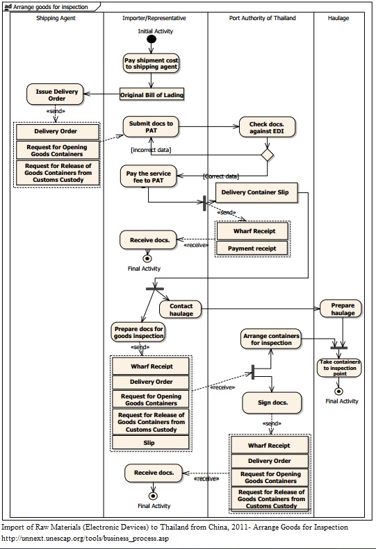 1. Importer pays the shipment cost to the shipping agent and submits an original and copy of bill of lading to the shipping agent 2. Shipping agent issues a delivery order and other related documents for the importer/representative as follows: - Delivery Order - Request for Opening Goods Containers - Request for Release of Goods Containers from Customs Custody 3. Importer submits these documents to the port - Delivery Order - Request for Opening Goods Containers - Request for Release of Goods Containers from Customs Custody 4. PAT checks documents against EDI system. If incorrect, documents are returned to the importer for re-submission 5. Importer pay the service fee to PAT 6. PAT issues the following documents for the importer - Wharf Receipt - Payment receipt - Delivery Container Slip 7. Importer sends the Delivery Container Slip to the haulage service so that the containers are taken to the inspection point. 8. Importer submits the following documents to PAT: - Wharf Receipt - Delivery Order - Request for Opening Goods Containers - Request for Release of Goods Containers from Customs Custody - Delivery Container Slip 9. PAT signs all those documents and arranges containers for the haulage to take them for Customs’ inspection