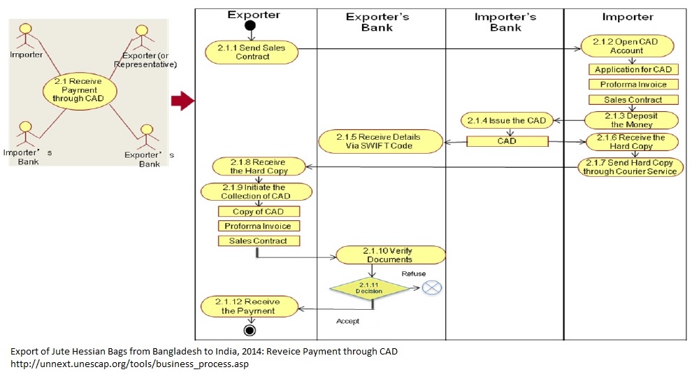 1 Exporter sends sales contract to the importer. 2 After agreeing on the sales contract the importer submits various papers to its bank to open a CAD account. 3 The importer deposits the full payment amount with his bank. 4 Importer’s bank issues the CAD, i.e. makes payment to exporters bank. 5 Exporter’s bank receives the details of the payment via SWIFT code. 6 Importer receives the hard copy of the issuance of CAD from his bank. 7 Importer sends the hard copy to the exporter through courier service. 8 Exporter receives the hard copy of the CAD. 9 Exporter initiates the collection of CAD through submitting hard copy of the CAD, proforma invoice and sales contract to his bank 10 Exporter’s bank verifies the documents. 11 If there is any problem with the submitted papers, exporter’s bank declines to make the payment to the exporter. If there is no problem, then exporter’s bank makes the payment to the exporter. 12 Exporter receives the advance payment and start processing the shipment of goods.