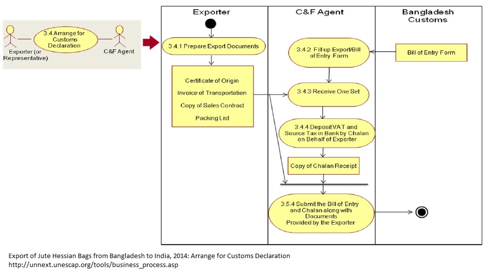 1 Exporter prepares documents for Customs declaration. These documents include COO, invoice of transportation, copy of sales contract, packing list. 2 The C&F agent collects export/bill of entry form from the Customs Authority and fills it up. 3 The C&F agent receives one set of the above-mentioned documents prepared by the exporter. Another set of the documents is kept by the exporter to be submitted later to the Customs Authority after C&F agent receives the chalan copy. 4 The C&F agent deposits VAT and Source Tax in bank by chalan on behalf of the exporter and receives a chalan copy. 5 The C&F agent then collects another set of the above-mentioned documents from the exporter and submits it along with the Bill of Entry and chalan to the Customs Authority