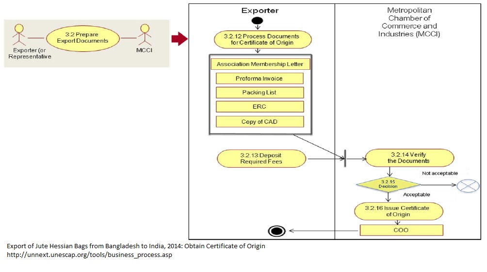 1 The exporter processes documents to obtain the Certificate of Origin by including Association membership letter, proforma invoice, packing list, ERC, Copy of CAD. 2 After attaching all necessary documents, the exporter deposits required fees for Certificate of Origin. 3 MCCI verifies all documents. 4 Based on the submitted documents, the MCCI decides whether to issue the certificate or not. 5 If satisfied with the documents the MCCI issues the Certificate of Origin to the exporter.