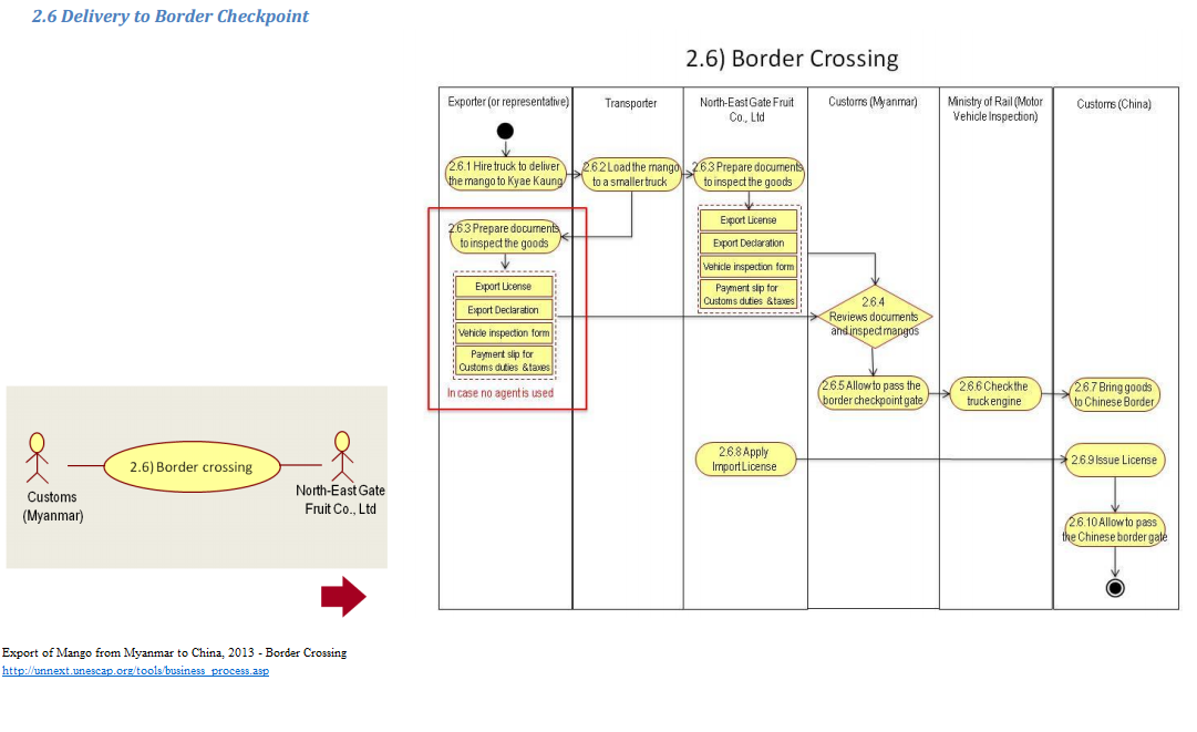 1 Exporter hires small truck to deliver the mango from the auction center to the Kyae Kaung border point. 2 The transporter loads the mangos onto the truck and transports them to Kyae Kaung. 3 North-East Gate Fruit Co., Ltd prepares all required documents for the inspection of the mangos by the Myanmar Customs 4 Myanmar Customs reviews the submitted documents and inspect the mangos. 5 If the documents and mangos meet all requirements Customs allows the truck to pass the border checkpoint gate. 6 Ministry of rail checks the truck condition including truck engine in order to prevent illegal import of truck spare parts. 7 The transporter brings the goods to the Chinese border 8 North-East Gate Fruit Co., Ltd applies for an Import License at Chinese Customs. 9 The Chinese Customs issues the Import License based on their regulations. 10 Chinese Customs allows transporter to pass the Chinese border gate.