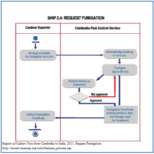 1. The Sanitary and Phytosanitary Certificates (“SPS Certificate”) are required when exporting cashew to most countries and depending on the risk factor. All EU shipments must be accompanied by a certificate from a recognized laboratory showing the goods to be within EU tolerance levels for Aflatoxin. The test must be conducted according to the European Union’s methodology. Certain countries require a Phytosanitary Certificate e.g. Australia, Russia, Greece, Turkey, India and Spain. 2. The MAFF/Department of Agronomy and Agricultural Land Improvement (“DAALI”) is responsible for issuing the SPS certificates, which certifies that the product is free from quarantined pests and significantly free from injurious pests which could damage crops. The SPS application process involves the following steps: The exporter submits a letter requesting SPS certification, along with the packing list and invoice, and for DAALI officers to inspect the cashew shipment. His request specifically mentions the buyer’s requirement as per the Purchase Contract. 3. DAALI makes a risk assessment based on the risk for pests, the source of origin of the cashew, the testing and inspection requirements of the importing country, and determines the export requirements and guidelines in Cambodia. Normally DAALI will arrange for fumigation, if needed, at least 15 working days before exporting. The full process for fumigation can take up to 96 hrs. The exporter usually does the follow up directly with the MAFF authorized fumigation company. A Fumigation Certificate is then issued. The certificate states the product, date, and dosage used for the treatment. The product is now SPS certified and ready for export.