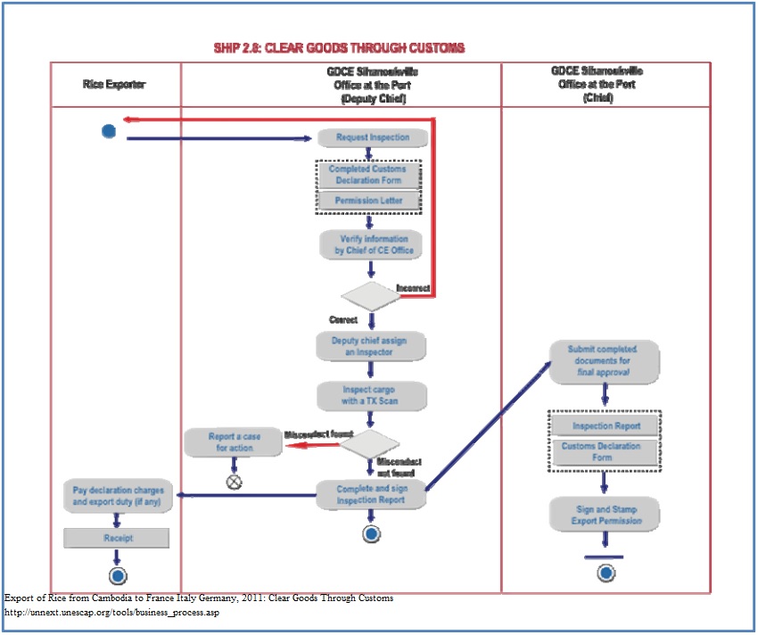 1. After the Permission Letter has been issued, a Customs Declaration Form will need to be completed at the DGCE. The exporter or freight forwarder takes both the Permission Letter and the completed Customs Declaration form to the Customs and Excise Office Chief for approval and requests inspection, goes to the Accounting Office and pays declaration charges and export duty, if any, and receive a receipt for payment. The Deputy Customs Chief will assign an inspector. Lastly, bring the Customs and Excise Office Chief signs and stamps the Inspection Report and the Customs Declaration form at the Customs and Excise Administration Office. (See Chart Ship 2.8) 2. Cargo Inspection: All exports must be examined by GDCE as a spot check, primary or in detail. The Customs and Excise Department is the lead agency in the inspection process. Goods are released when documents are approved, the export tax if any is paid for, and examination is completed. 3. An Export Office at GDCE headquarters takes charge of the rice exports, which examines and seals cargo with a container bolt seal (either at Dry Port premises or at Green Trade Co where the rice is milled and packaged) that conforms to international standards. Customs at Sihanoukville port do not reopen the containers. They generally check the related documents and verify the seals on the containers. Once all the documents and container seals are checked by GDCE, containers are loaded on the vessels for export. 4. The container may also require scanning, depending on the type of goods and the risk management assessment. As a matter of practice, cargo is always inspected using a TX Scan located in the port. The exporter needs to pay a scanning fee to AZ company which is located at the port. The scanning charge depends on the size of the container. For 20-foot containers, the charge is $40. For 40-foot containers, it is $60. Once the inspection is completed, an Inspection Report will be completed and signed.